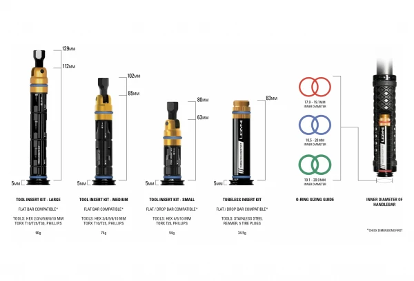 Le multi-outils, Tool Insert Kit, est construit en aluminium usiné léger et durable et comprend des embouts en acier trempé. Le kit est facilement accessible pour des réparations rapides et est livré avec cinq (petits), huit (moyens) ou 11 (grands) outils différents.