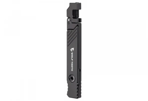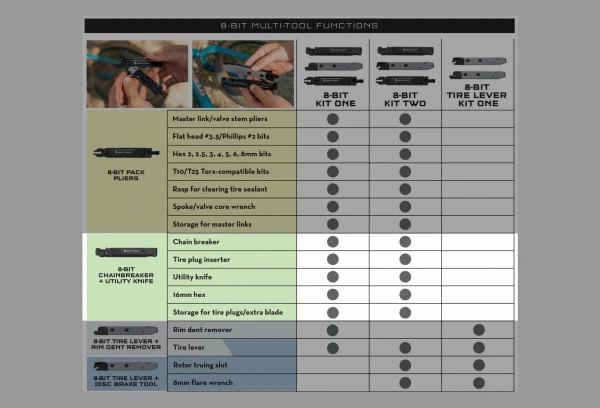 - 8-Bit Chainbreaker + Utility Knife Multi-tool (4 fonctions). Il comporte un dérive-chaîne à une extrémité et une lame de cutter rétractable à l’autre. Le dérive-chaîne est actionné par une clé en L hexagonale de 3 mm (incluse) qui sert également d’outil d’insertion pour mèche tubeless. Une fente usinée permet d’insérer la clé en L et de transformer l’ensemble en un outil de réparation pour pneu tubeless, l’extrémité fourchue de la clé en L s’étendant vers l’extérieur. Les poignées de cet outil s’ouvrent par glissement pour permettre de ranger les mèches tubeless, un obus de valve et une mini-lame de cutter de rechange. La quatrième fonction est la tête dérive-chaîne de 16 mm qui peut être utilisée pour serrer un bras de manivelle desserré pendant les randonnées.
