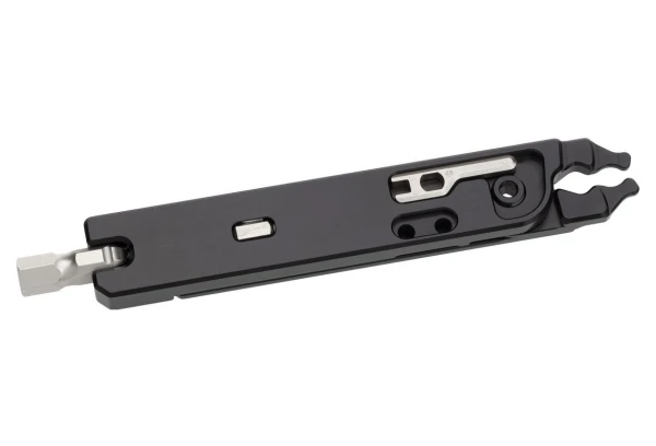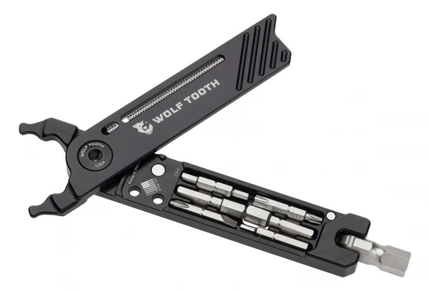 Le Wolf Tooth 8-Bit Pack Pliers est un multi-Outils léger doté de 17 fonctions. Huit accessoires s’emboîtent à l’intérieur des poignées de la pince à maillons rapides à l’aide d’aimants et d’un système de rangement intelligent. Ces accessoires s’insèrent ensuite dans une tête pivotante de 8 mm, dotée d’une ouverture de 4 mm pour les embouts hexagonaux, ce qui ajoute des fonctionnalités à la pince à maillons déjà polyvalente. Ce nouvel outil multifonction a été créé pour résoudre presque toutes les réparations mineures, en VTT et sur route.