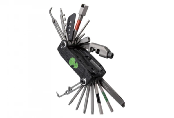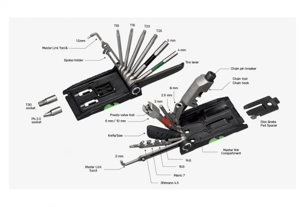 Le multi-outils Topeak dispose de 34 fonctions qui vous permettent d’effectuer la plupart des réparations durant une sortie vélo.